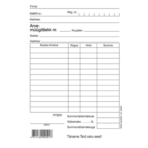 (Eesti) Arve-müügitšekk A6, pikuti, 100 lehte